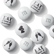 These will be your best-dressed guests. Our pre-designed M&M'S® chocolate candies come with hearts, flutes toasting, and the words, “Eat, Drink & Be Married”. They’re so fun and flavorful, you won’t care that they showed up in white.