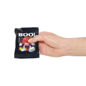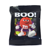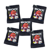 Minimum order of twenty (20) favor packs filled with 1 oz of personalized M&M’S® chocolate candies. Black favor pack features our Red character in a purple cape and the message “BOO!” printed on the front. A transparent window on the front shows the colorful candies inside. Filled with personalized M&M’S® chocolate candies, choose your colors and add photos, messages, or clip-art. Unique trick-or-treat favors, Halloween party favors, or trunk-or-treat giveaways.
