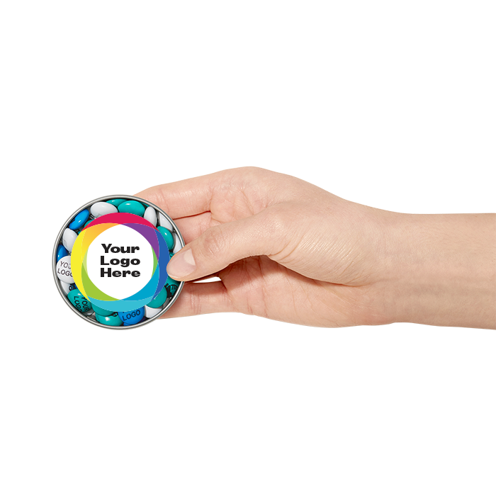 Each silver candy tin, complete with a clear, removable top, is filled with a delicious serving of M&M’S you can customize in dozens of different ways. Create your own blend – add your company logo, colors, taglines, product or service names, business email, and website.