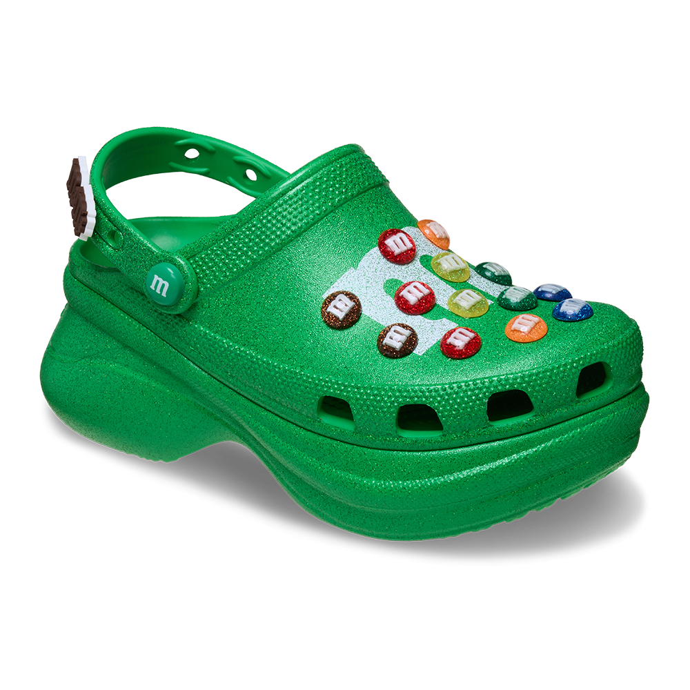 Put your sweetest foot forward with our limited-edition M&M’S x Crocs Bae Clog. These comfy green stunners showcase the iconic ‘m’ logo, include a platform heel, a glitter treatment, and M&M’S Jibbitz™ charms.