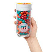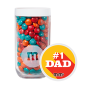 Clear jar filled with 12.7 oz (360 g), 13 servings, of personalized M&M’S® chocolate candies Personalize M&M’S® chocolate candies with colors, a photo, names, messages, and clip-art Choose from 2 different lid designs #1 Dad lid: white text on yellow & red background I <3 U Dad lid: white text on light blue background with a grill Perfect personalized, unique gift for Father’s Day or his birthday