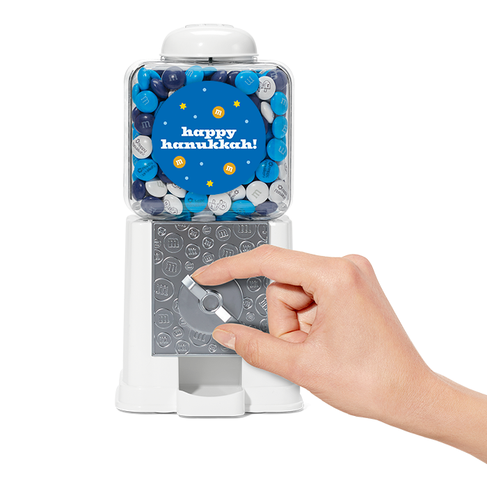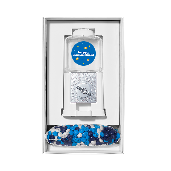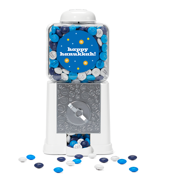 For a sweet twist on the tradition of gift giving, fill this retro-style gumball dispenser with your own custom created M&M'S® chocolate candies and prepare to share. Complete with its own gift box, there's no wrapping needed, and inside it's dressed to impress with a gold and blue star design and the phrase, "Happy Hanukkah!" Dispenser only to be used with Milk Chocolate M&M'S.
