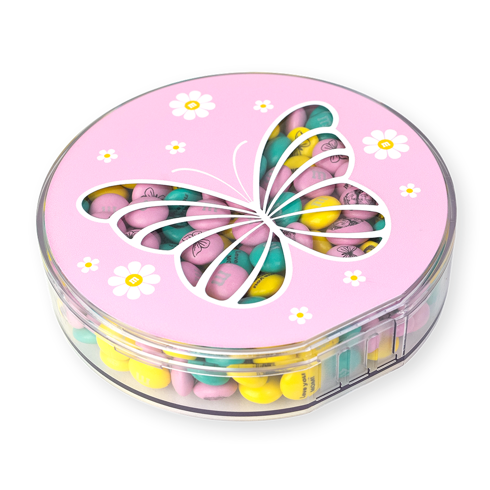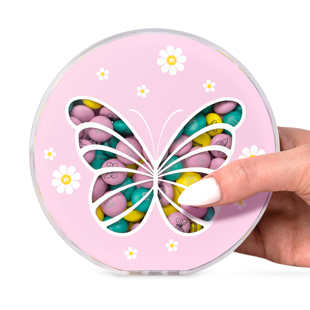 Spread your wings and make someone's day a little sweeter with our Round Butterfly Gift Box. This adorable treat box is the perfect way to celebrate a birthday, baby shower, or just because. Create your own colorful blend of M&M'S® chocolate candies and add a personal touch with clip art, messages, or photos.