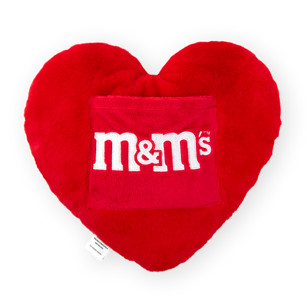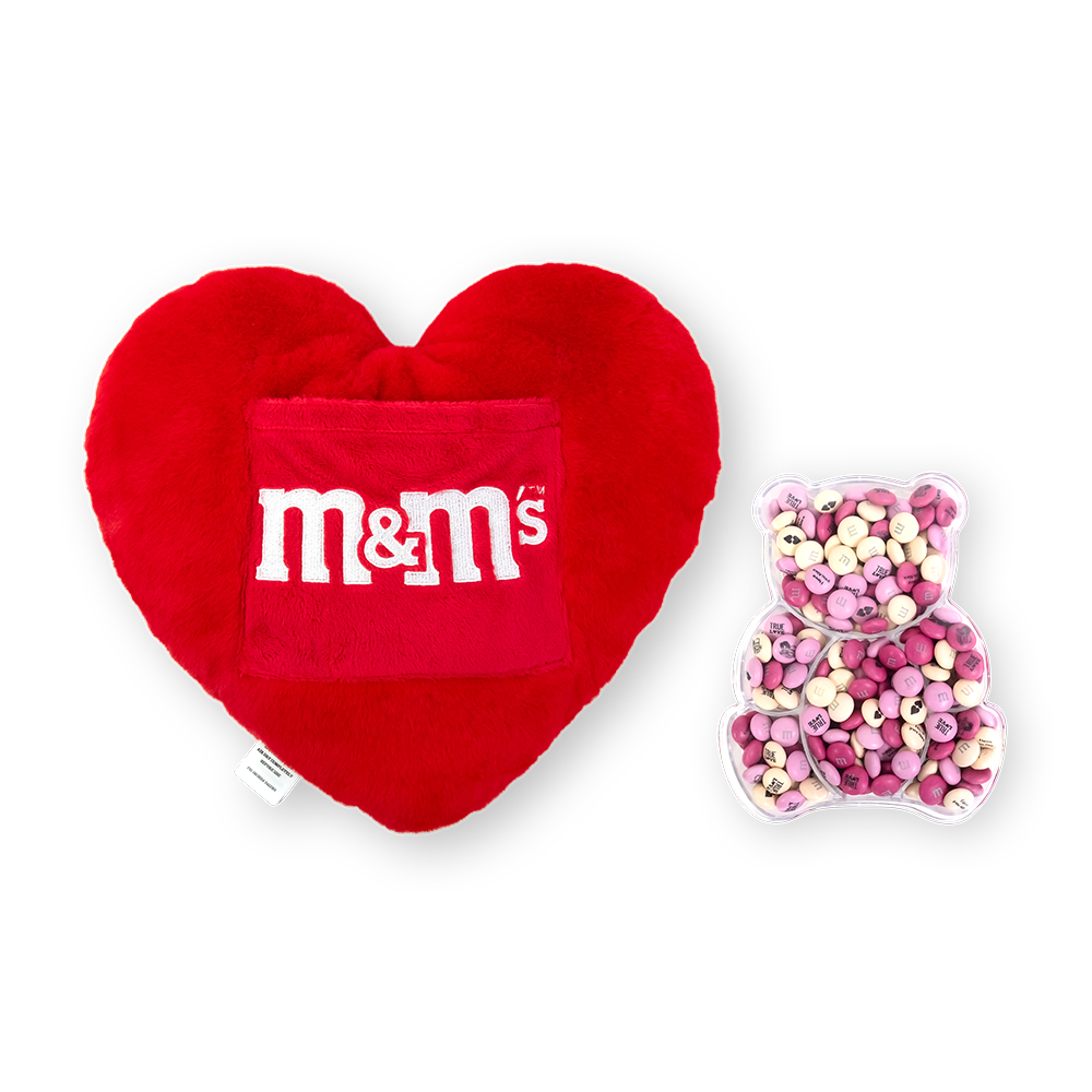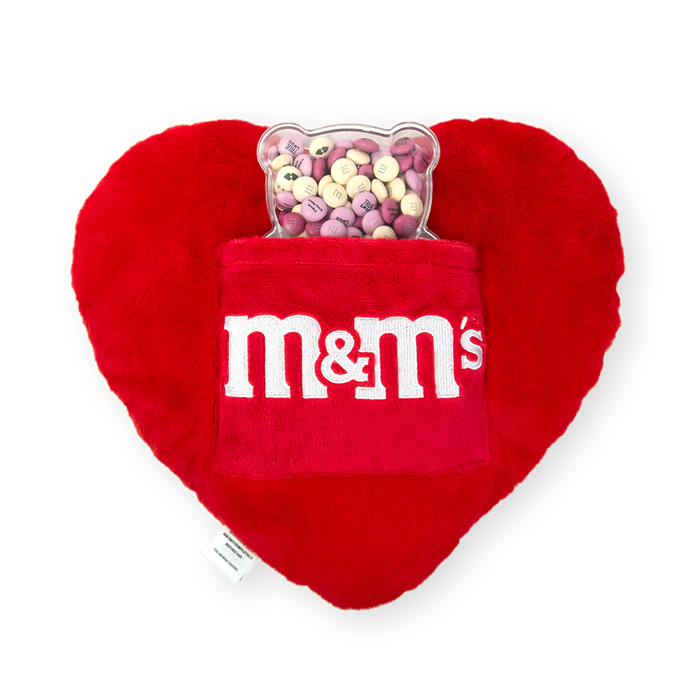 Share your love in a delicious way. Our sweet teddy bear is filled with personalized M&M’S® chocolate candies and arrives with a red, plush heart-shaped pillow. Choose favorite colors, photos, messages, or clip-art to personalize your M&M’S® chocolate candies. The M&M’S® branded pillow includes a pocket on the back where you can tuck the teddy bear, or perhaps add a love note too.