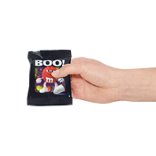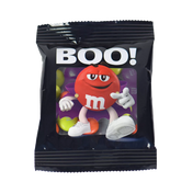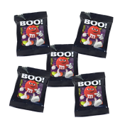 Set of thirty (30) favor packs filled with 0.75 oz (21 g) of personalized M&M’S® chocolate candies Black favor pack features our Red character in a purple cape and the message “BOO!” printed on the front. A transparent window on the front shows the colorful candies inside. Filled with pre-designed M&M’S® chocolate candies: orange, purple and electric green with a bat, “BOO!” and “Happy Halloween” clip art. Unique trick-or-treat favors, Halloween party favors, or trunk-or-treat giveaways.