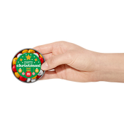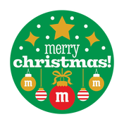 each tin contains a serving of personalized M&M'S® chocolate candies design on front is a festive green circle that says “merry christmas” in the center surrounded by ornaments and stars cute treat for holiday parties, stocking stuffers, or to give to coworkers