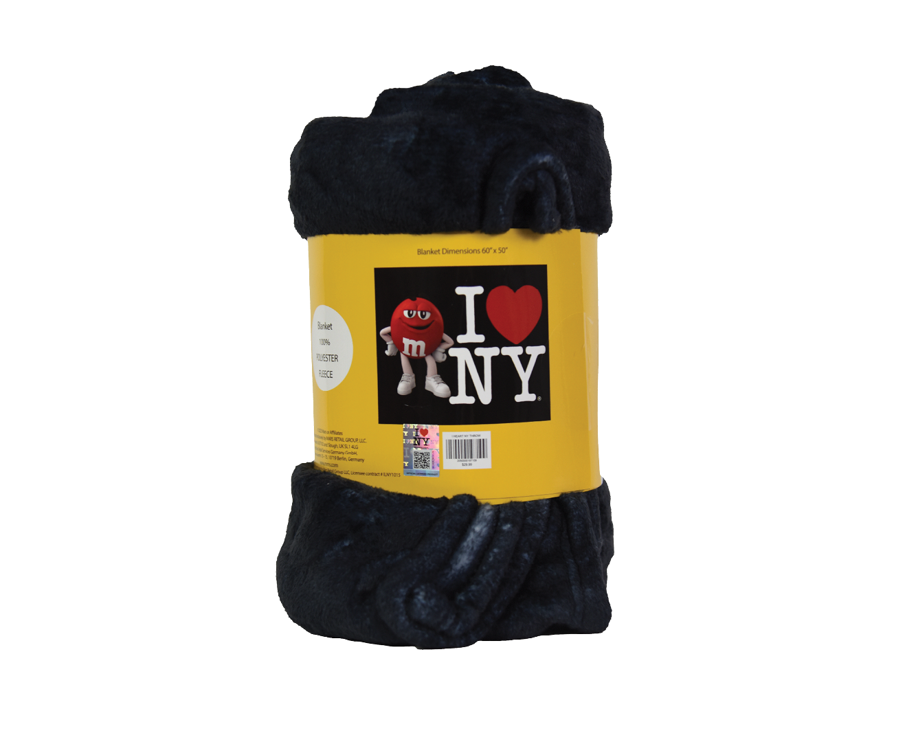 This M&M’S® throw blanket brings some character to your snuggle time or your bed. The front of the black blanket showcases the Red character with his hands on his hips and a large “I Heart NY” graphic. Whether you live in New York, have visited the Big Apple, or dream of going to New York City, this blanket is a fun souvenir or manifestation of your dreams. The cozy blanket is a fun addition to dorm room décor, decoration for your bedroom, or a throw blanket for your couch.