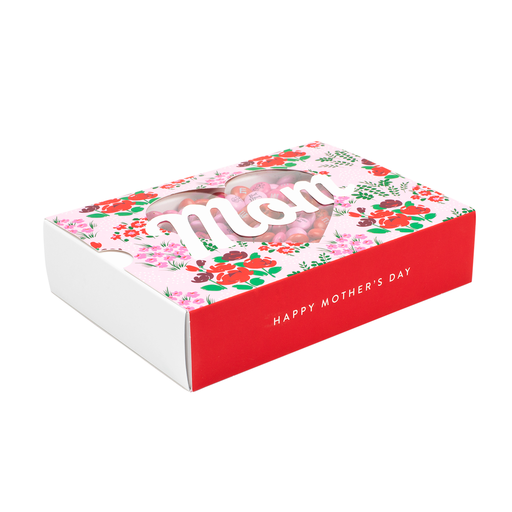 Surprise your Mom with the perfect Mother’s Day gift that will satisfy her sweet tooth and show how much you love her. The Happy Mother’s Day Gift Box is exactly what she wants on her special day. The pretty pink and red gift box features a colorful floral print, the fancy word MOM, and a heart-shaped cut-out revealing the decadently delicious M&M’S that are custom-decorated with unique messages and clip-art created just for her. Both sides of the box say Happy Mother’s Day to really make her feel extra appreciated.