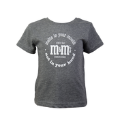 Heather gray scoop neck short-sleeve t-shirt with rainbow neck tape. Original M&M’S® logo on the chest surrounded by the classic slogan “melts in your mouth, not in your hand”. Toddler t-shirts: white print on heather gray shirt, sizes 2T - 4T. Unique gift for lovers of vintage t-shirts or a fun group gift for family reunions, vacations, or your circle of friends.