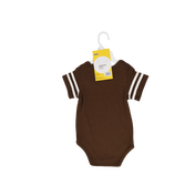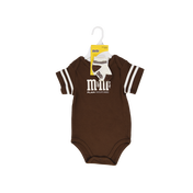 Brown M&M’S® onesie with white stripes on the sleeves paired with white baby socks with brown stripes on the ankle. Yellow M&M’S® Peanut onesie with brown stripes on the sleeves paired with brown baby socks with yellow stripes on the ankle. Vintage M&M’S® logo on the chest of the onesie. Snap closure at the bottom of the onesie. Sizes: 6MO - 24MO Unique gift for new baby, first birthdays, or just because.