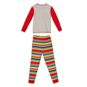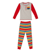 100% cotton two-piece pajamas Rainbow striped pants and long-sleeve onesie that includes snaps on the bottom Shirt is light heather gray with red sleeves, and a rainbow pocket that features the “m” logo Toddler sizes available in 2T, 3T, and 4T Perfect matching family pajamas for holiday photo cards Fun, colorful gift for babies and toddlers