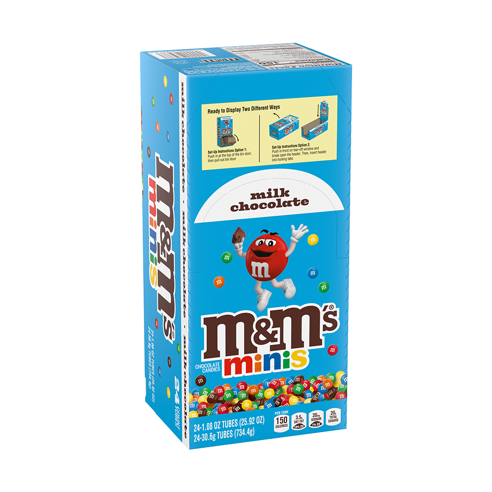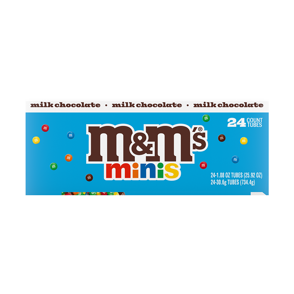 Box contains twenty-four (24) 1.08-ounce tubes of M&M'S MINIS Size Milk Chocolate Candy, packaging may vary.