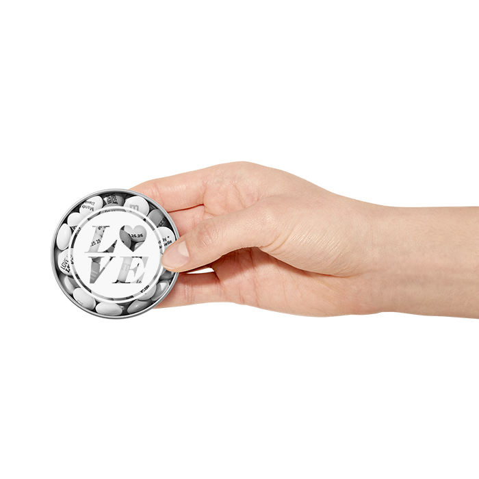 Love brings everyone together. So do these favor tins. With the word itself on the outside, and personalized M&M’S® chocolate candies on the inside, sharing the love is easy.