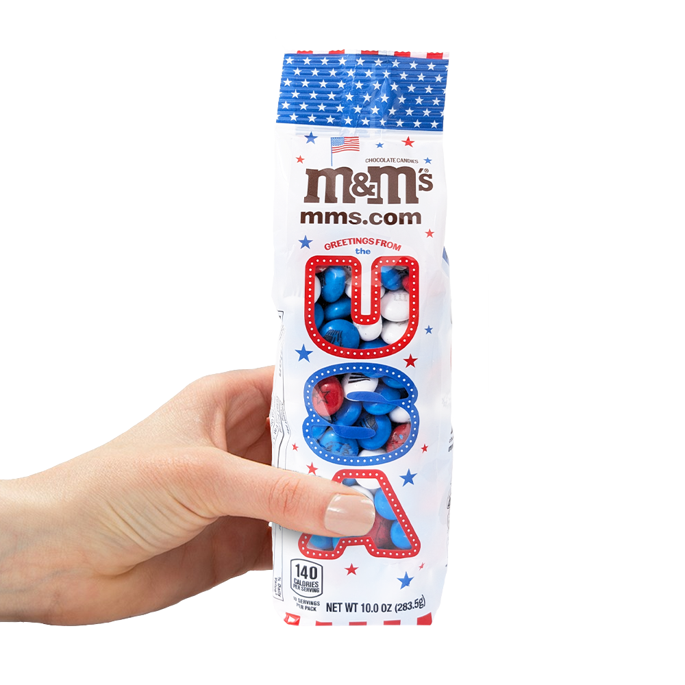 Patriotism tastes so sweet when you celebrate with our patriotic M&M’S® milk chocolate candy. Our 10oz bags are decorated with stars and stripes and have a USA shaped transparent window to show off the red, white, and blue candy inside, which is printed with flags, eagles, and stars. A dessert and party décor all-in-one! Use this pre-designed patriotic chocolate candy to fill your candy bowls, create party favors, or decorate cakes. Patriotic M&M’S® chocolate candies will add color and fun to your Memorial Day, Flag Day, Independence Day, Veteran’s Day, or Labor Day celebrations.