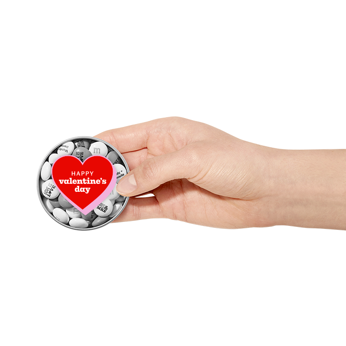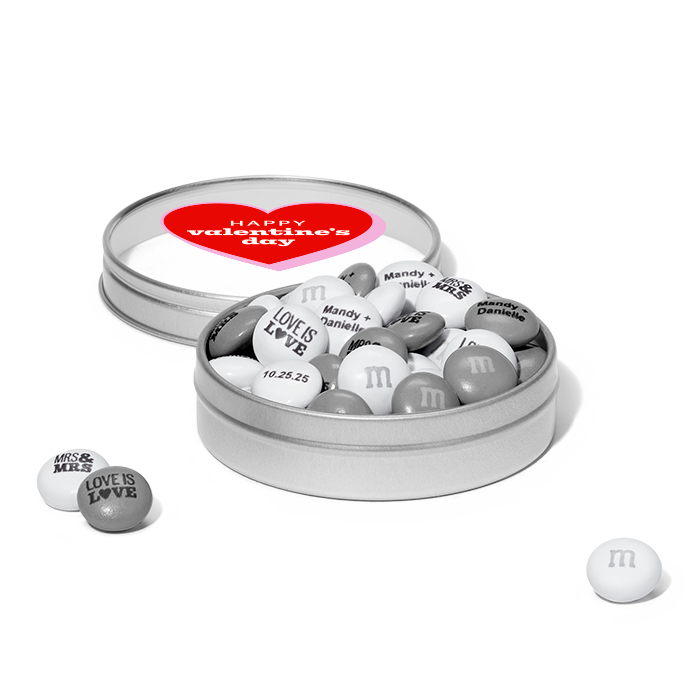 Spread the love (and the candy) this Valentine's Day. These tins are ideal for group gifts, teams, and parties. The transparent lid shows off the personalized M&M’S® chocolate candies inside. Share sweet love far and wide!